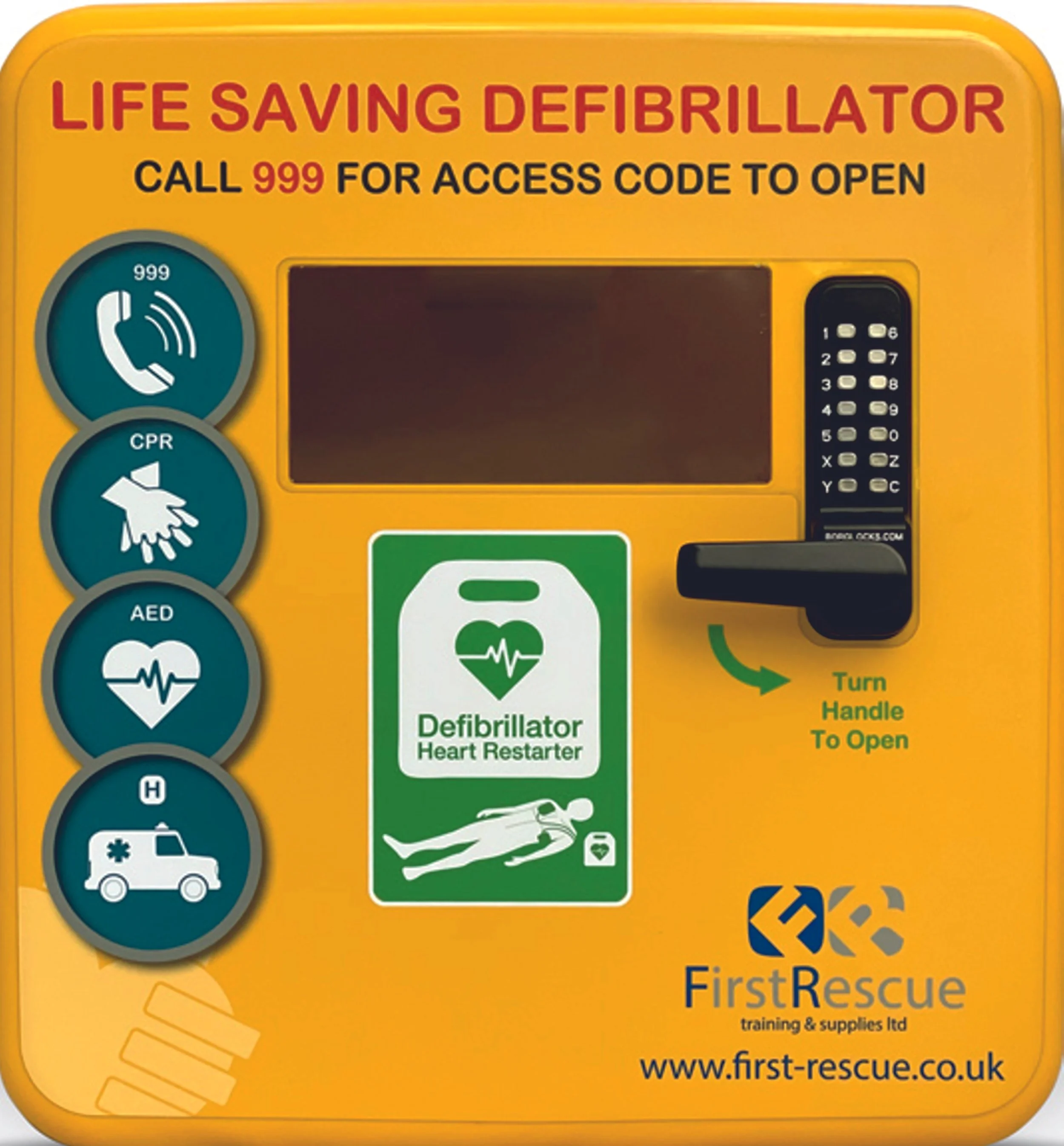 Information about how to open the device casing and access the difibrilator is on the device and instructions for use are provided.