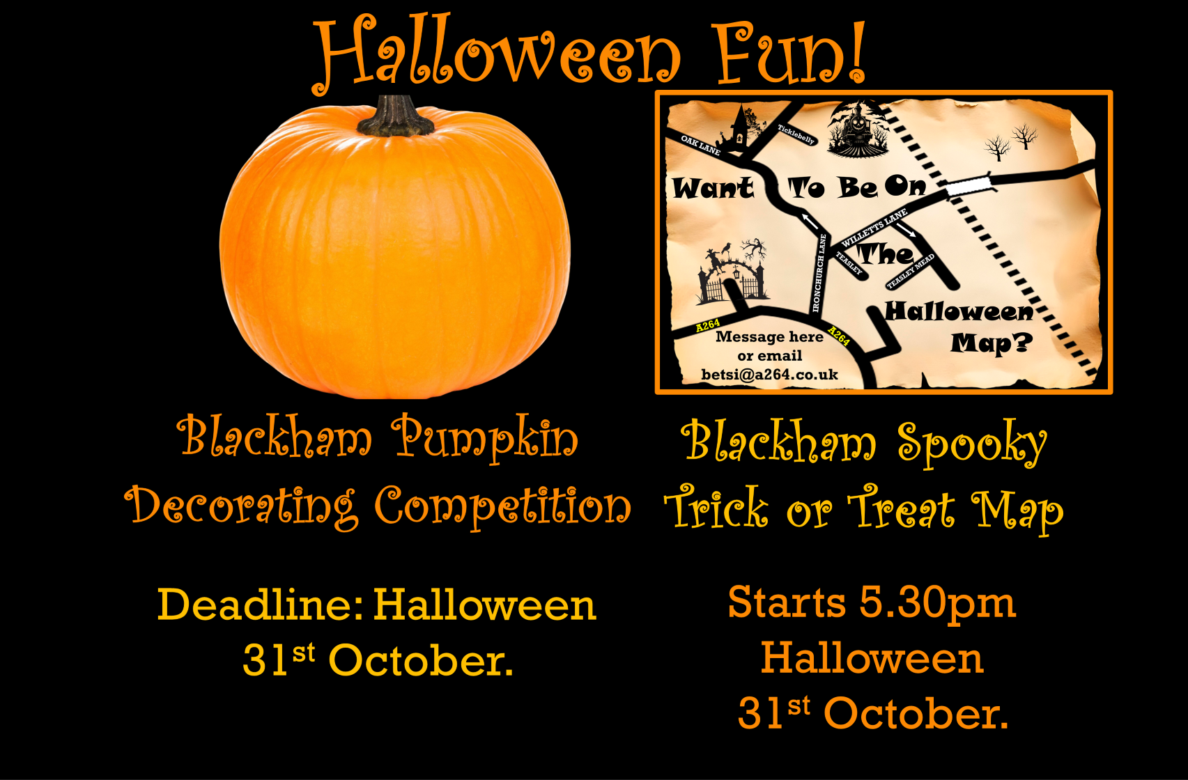 And on the Halloween Night itself, follow the map to visit the particiapating homes and locations in Blackham where Trick or Treaters are welcome. (We are more about Treats than Tricks in this village so leave rotten eggs and tomatoes at home please!).